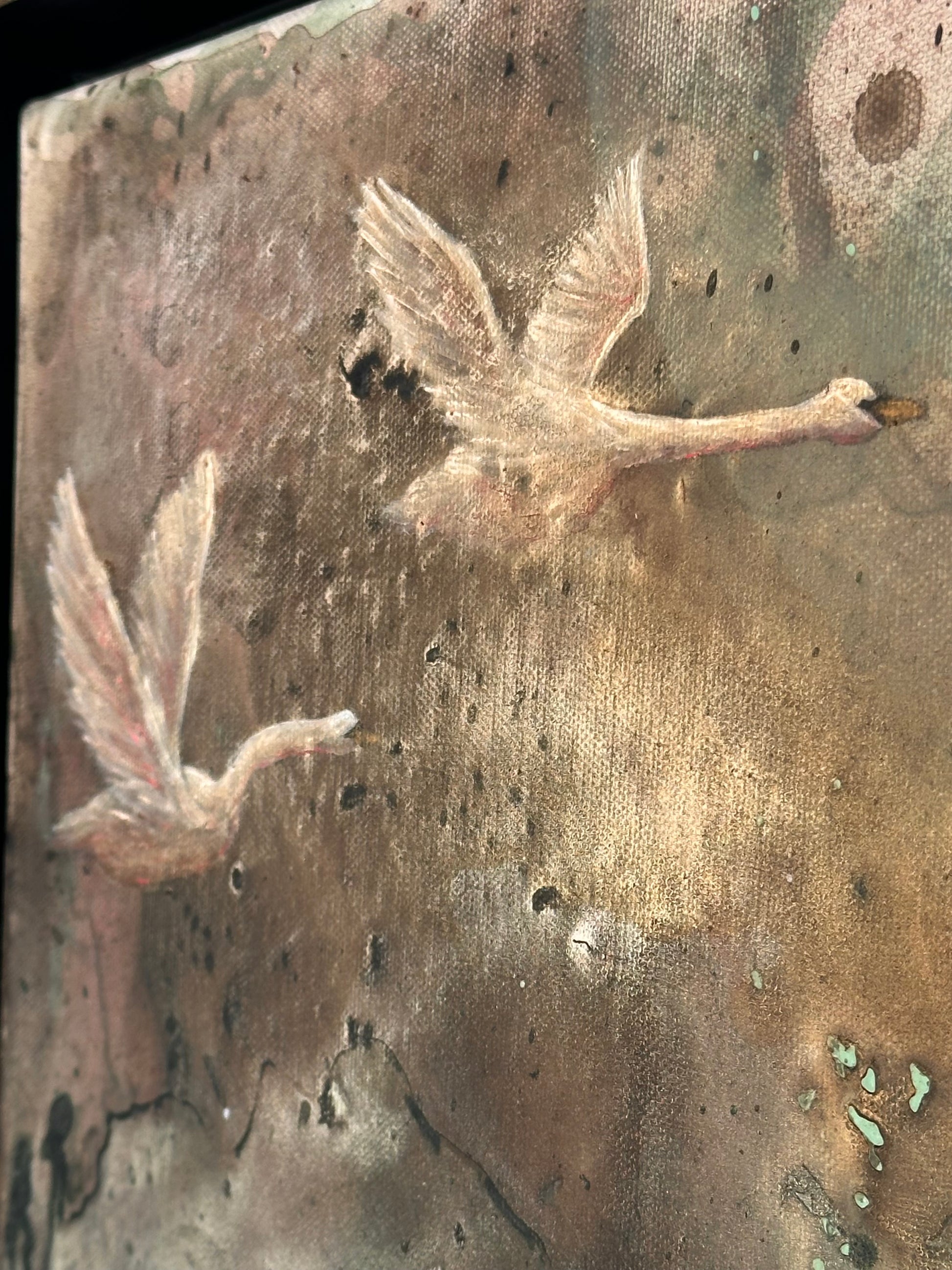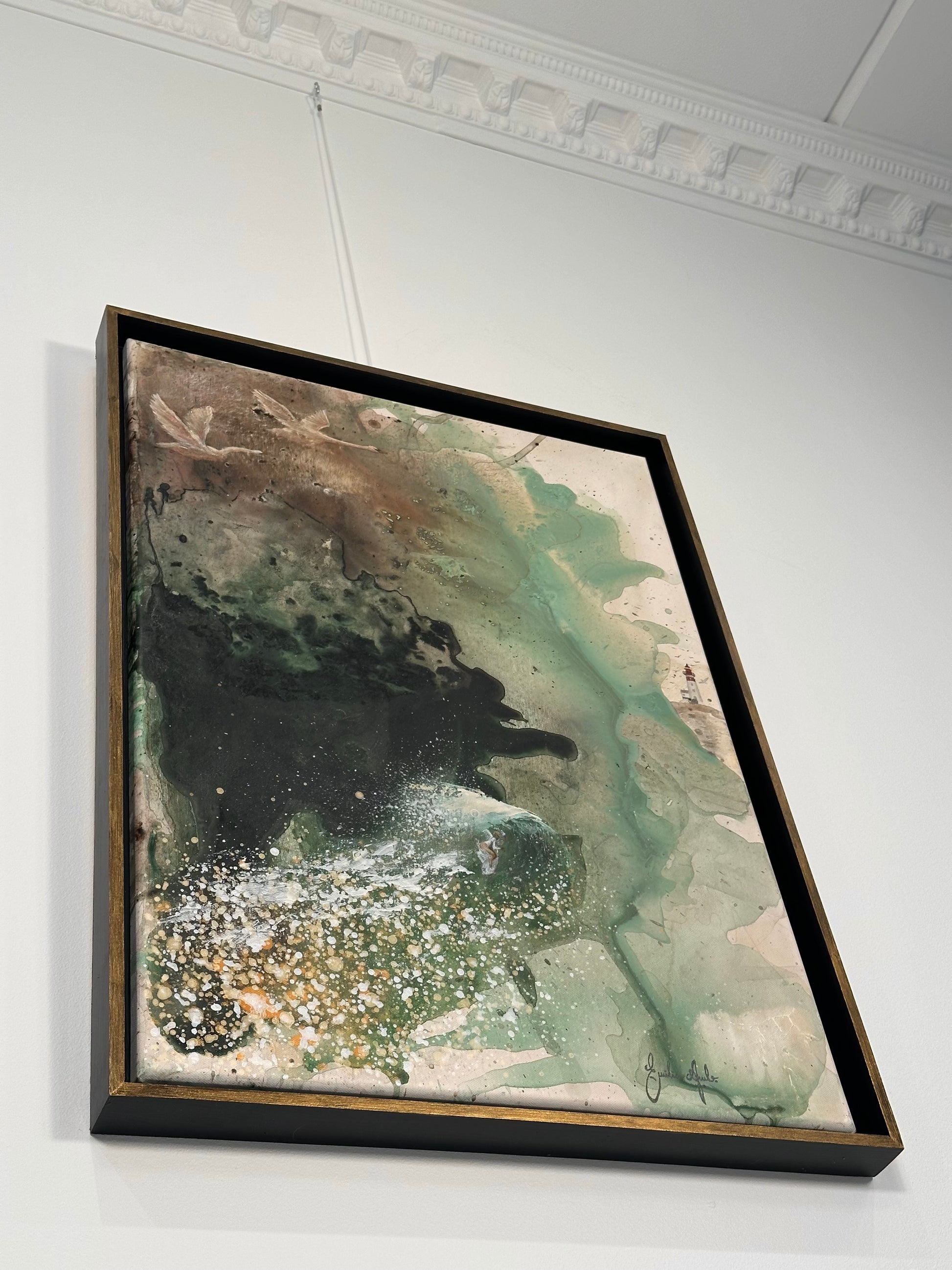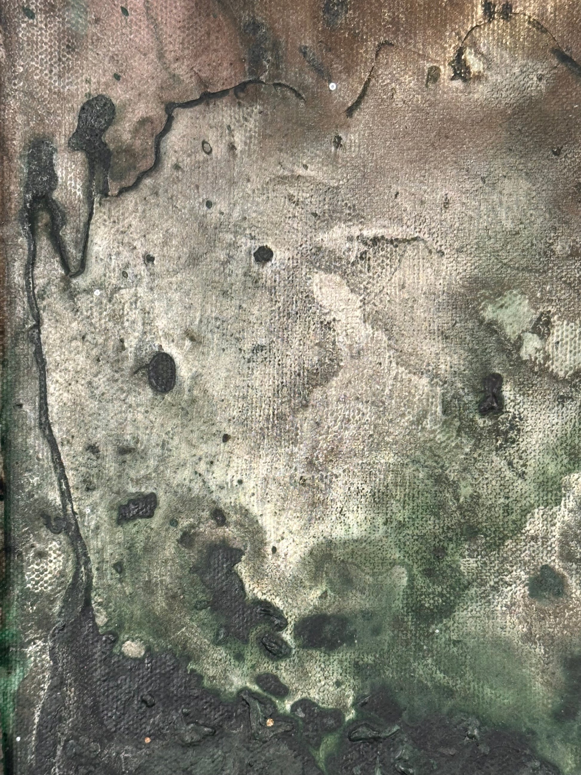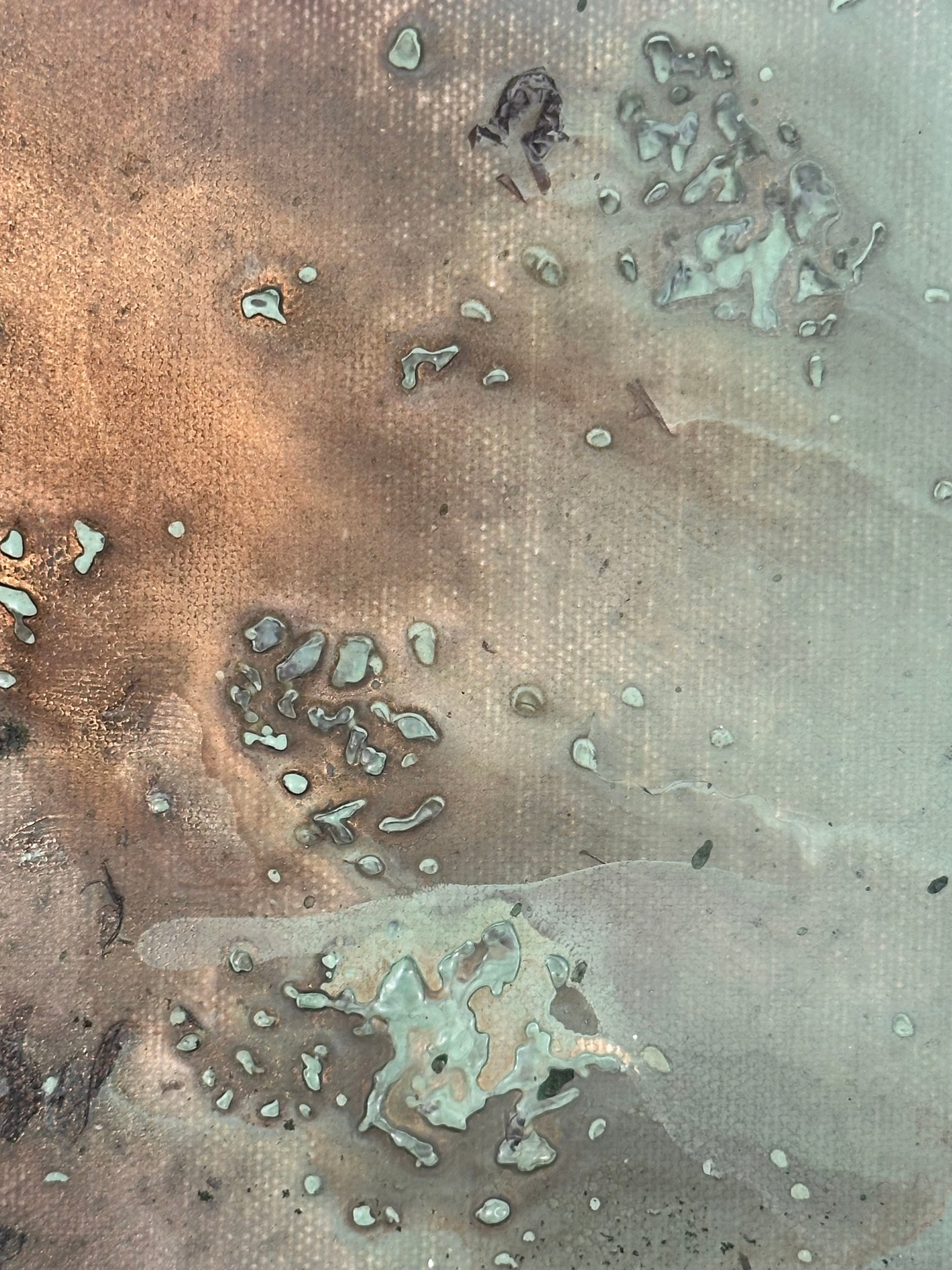 The very first layer of this painting was created by the water at my parents’ place, a spot that holds deep peace and grounding energy for me. It began over a year ago, then sat quietly in my studio, almost as if it needed to absorb the energy of time before revealing its full form. Like a seed buried in the dark, it marinated, transformed, and slowly grew into what you see now. The journey of this painting mirrors the soul’s evolution—slow, sacred, and full of grace.