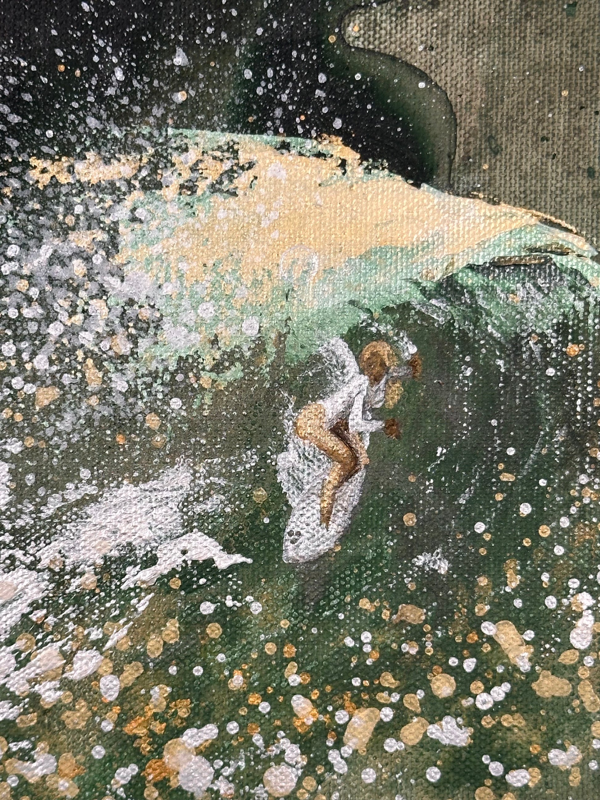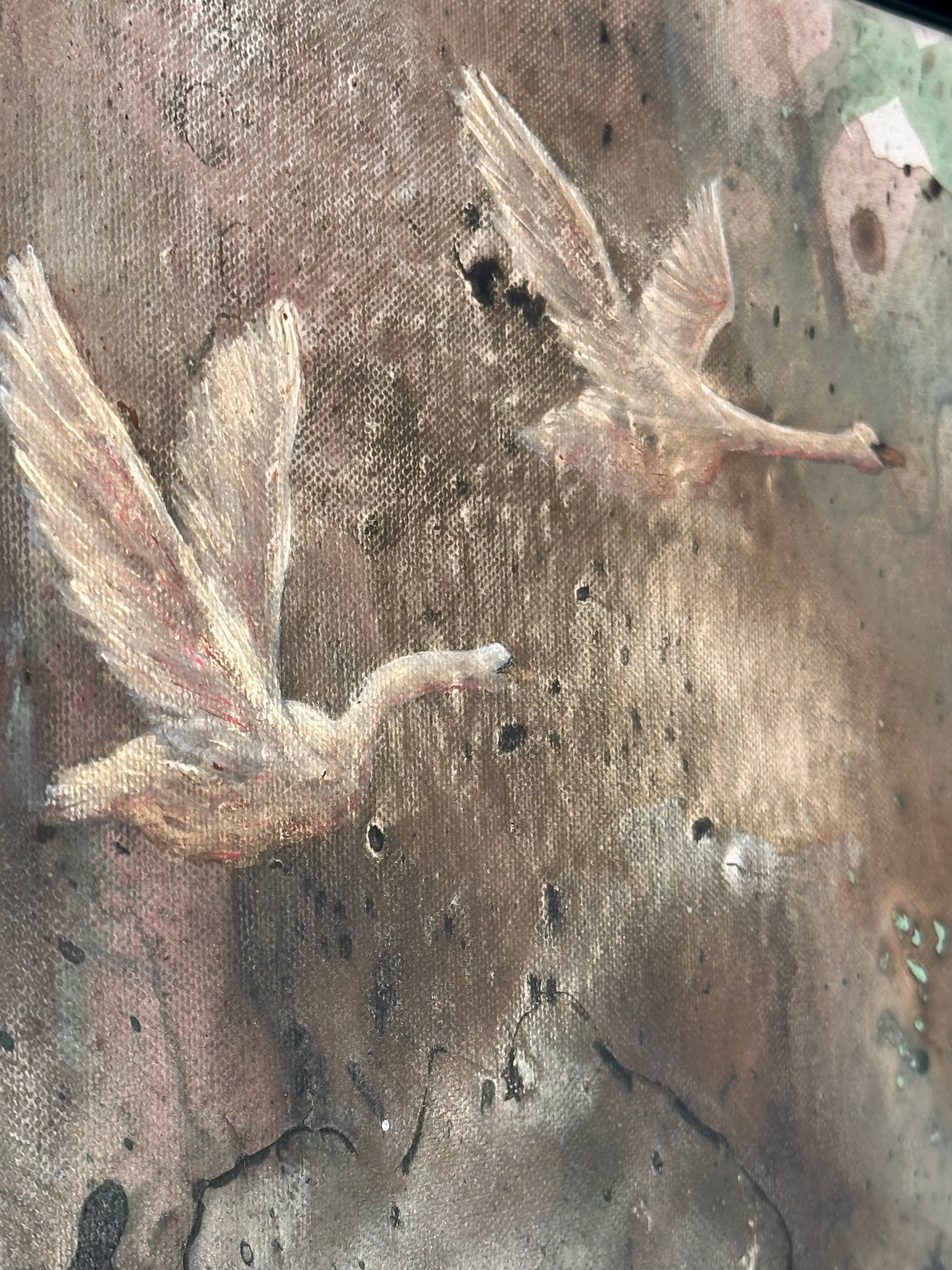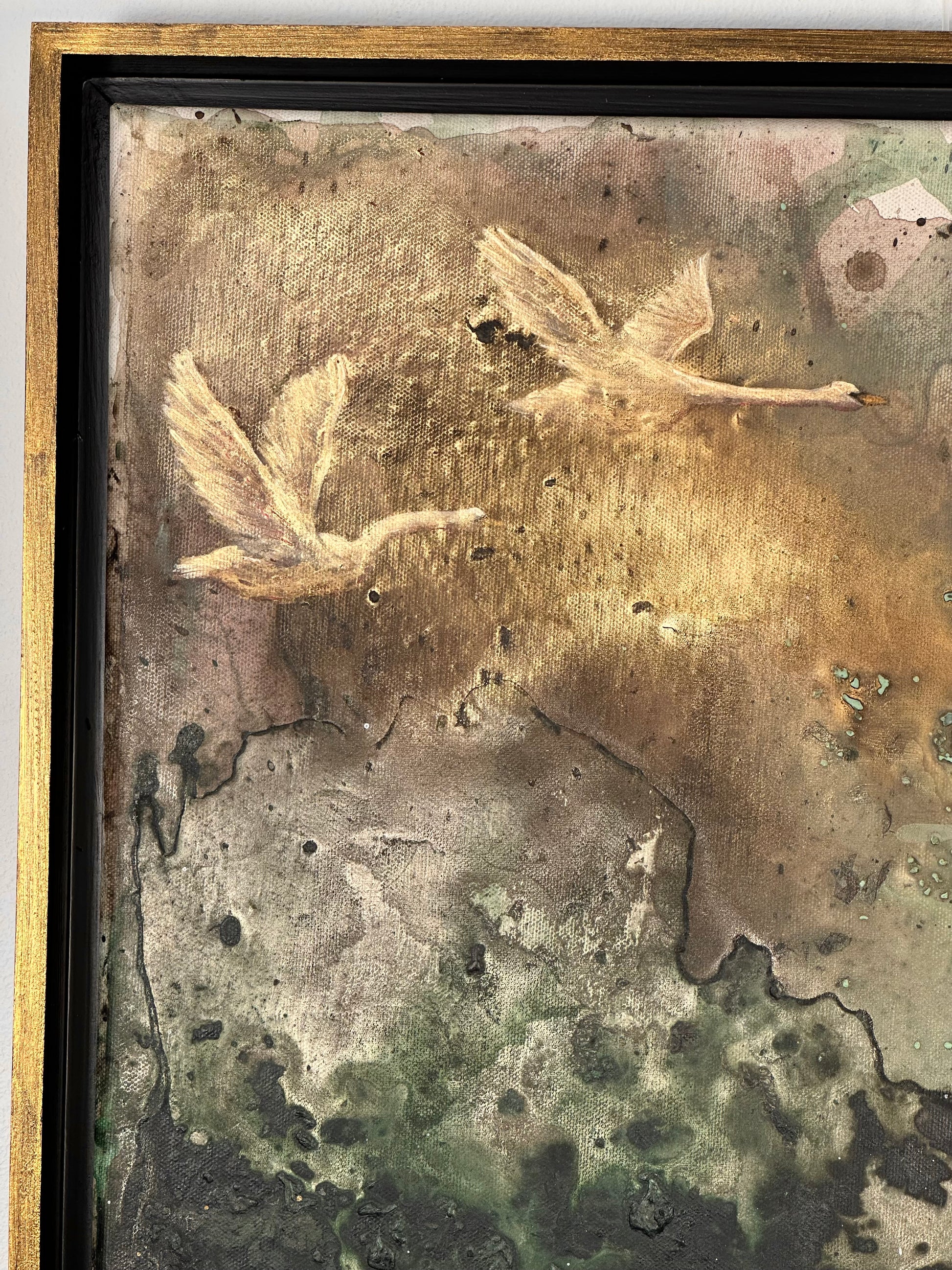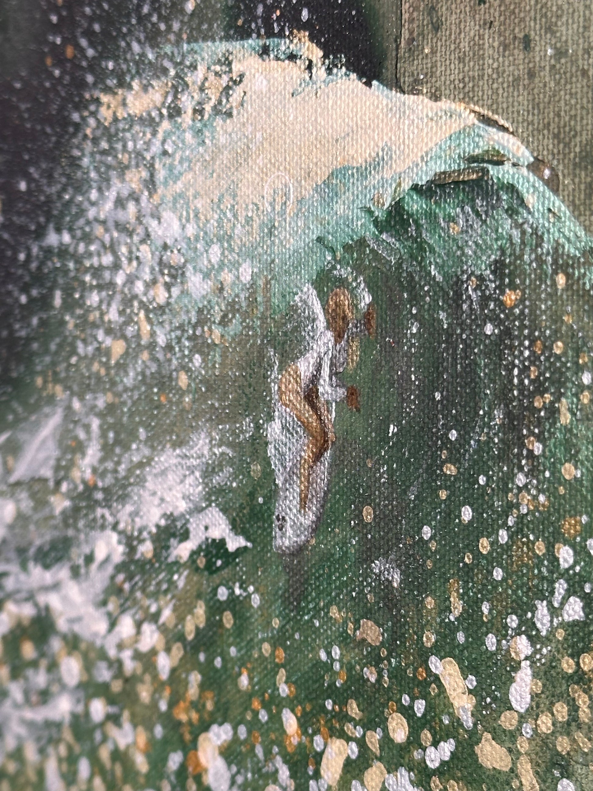 The very first layer of this painting was created by the water at my parents’ place, a spot that holds deep peace and grounding energy for me. It began over a year ago, then sat quietly in my studio, almost as if it needed to absorb the energy of time before revealing its full form. Like a seed buried in the dark, it marinated, transformed, and slowly grew into what you see now. The journey of this painting mirrors the soul’s evolution—slow, sacred, and full of grace.