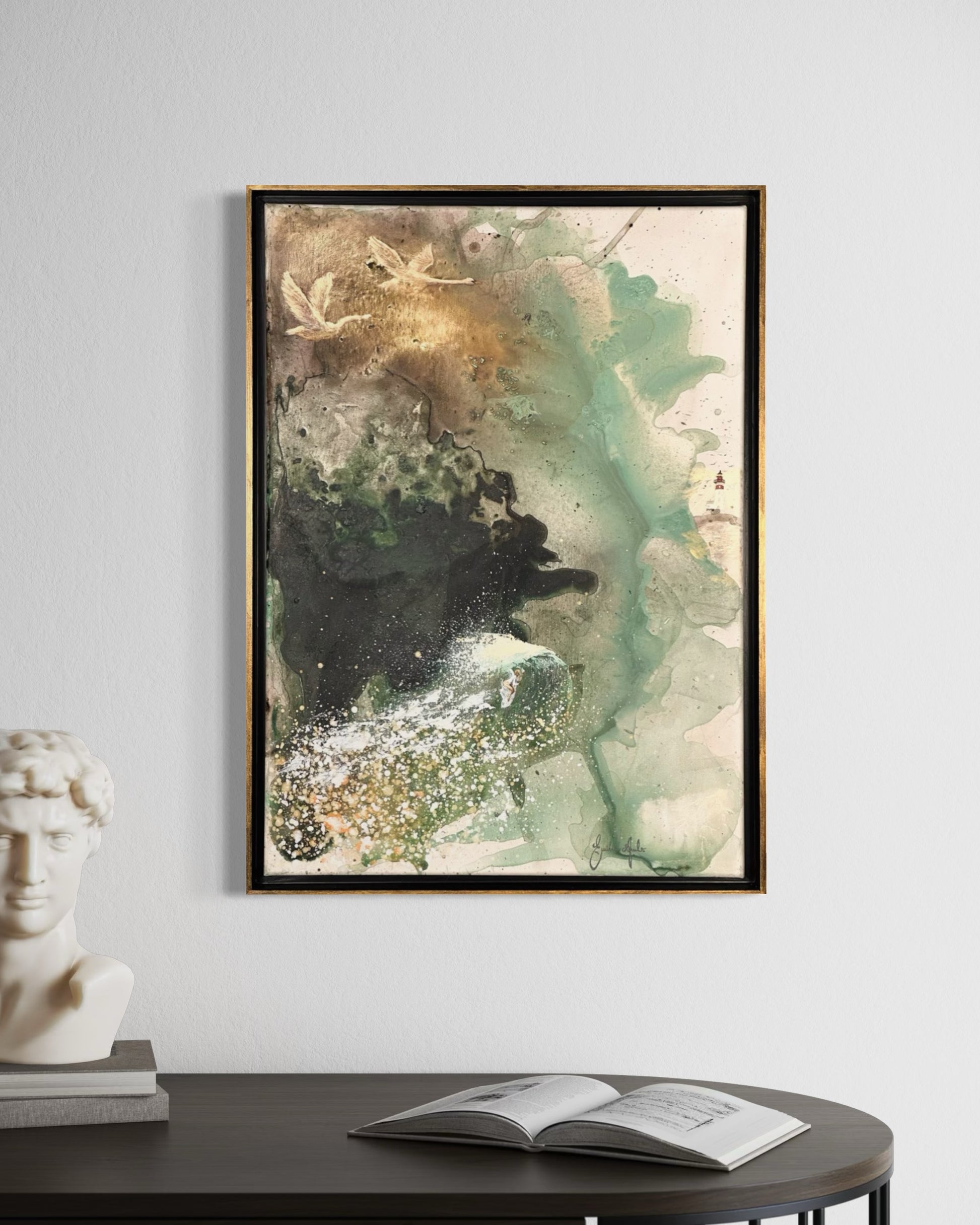 I’ve chosen a floater frame design to enhance the depth of the art, creating a visually striking and more expansive look. In my opinion, this design elevates the artwork, giving it a majestic presence that perfectly complements my style. The frame completes the piece, making it ready to find its forever home.